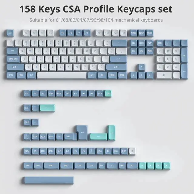 What you get is 158 keys blue and white keycaps set, including 104 standard keys, 54 supplementary keys. No keyboard included. Our worry-free 365 days warranty.