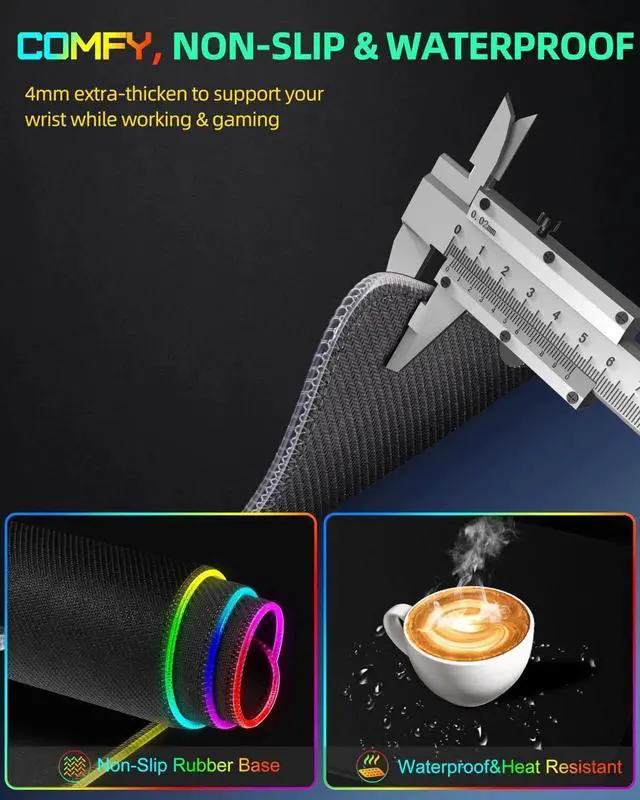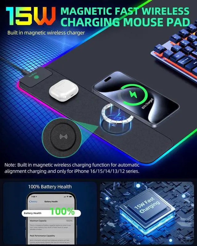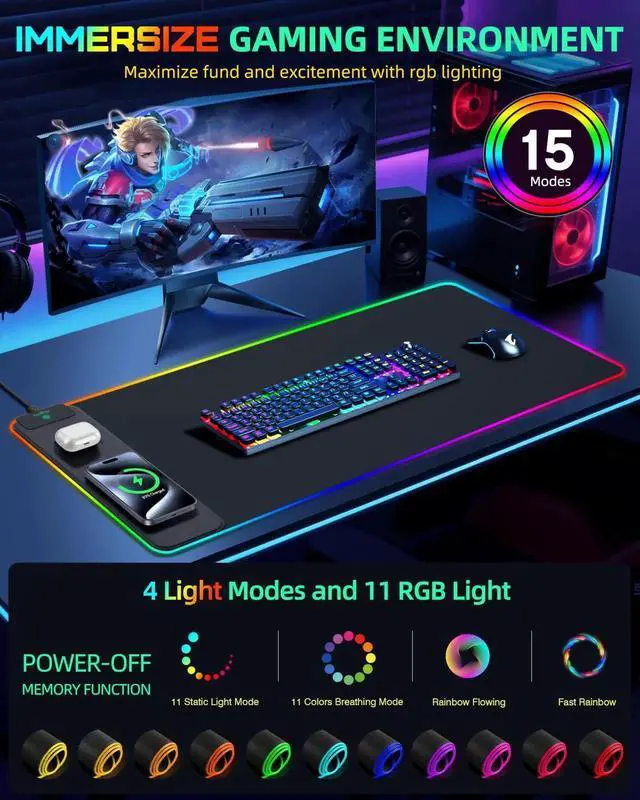 Mouse Pad with Wireless Charging, RGB Gaming Desk Mat, 31.5" x 15.7" Large XXL Desk Pad, 15 Lighting Modes, Non-Slip Mouse Mat, Waterproof Computer Keyboard Pad, Black with 20W PD Power Adapter