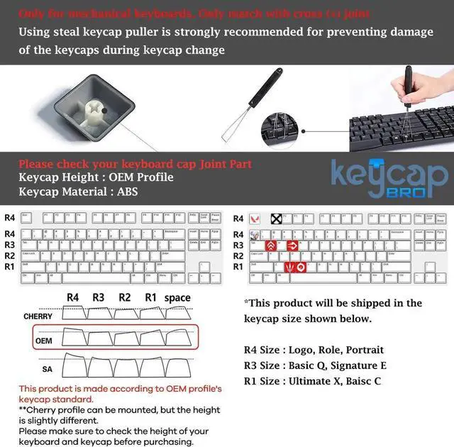 Keycap Standard: OEM profile, Keycap Material: ABS plastic - Fit with any mechanical keyboard. The Cherry keycap profile can be mounted, but the height is slightly different