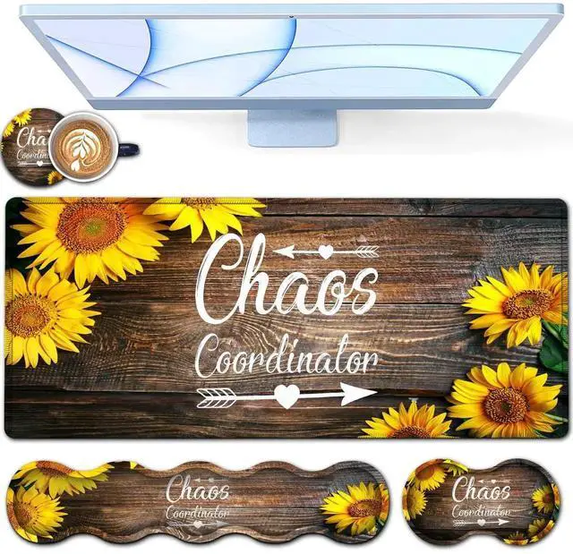 Desk Pad, Keyboard Mouse Pad Set, Extended Gaming Mouse Pad+ Ergonomics Memory Foam Wrist Rest Support, 31.5 x 11.8 in Waterproof Large Mouse Pad for Home Office, Chaos Coordinator Sunflower XXL Mouse Mat