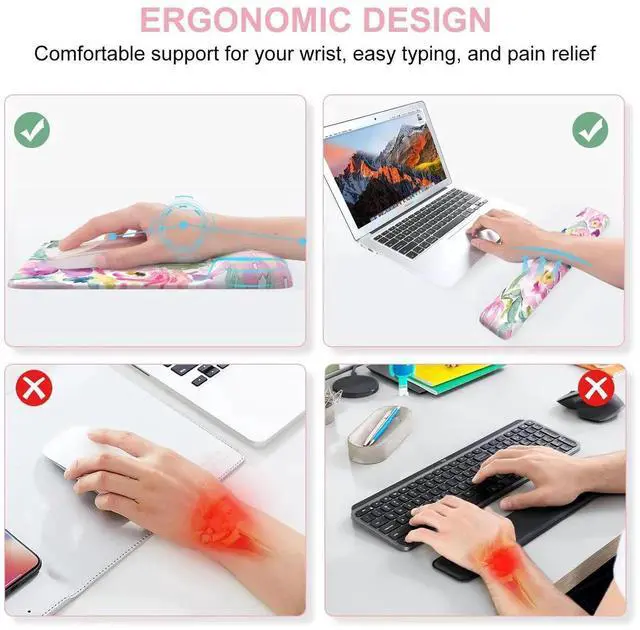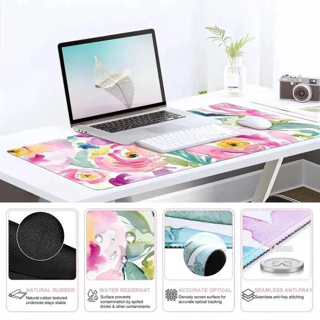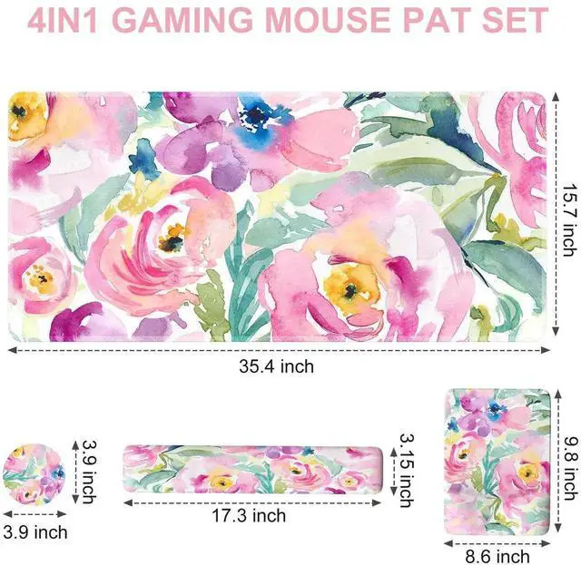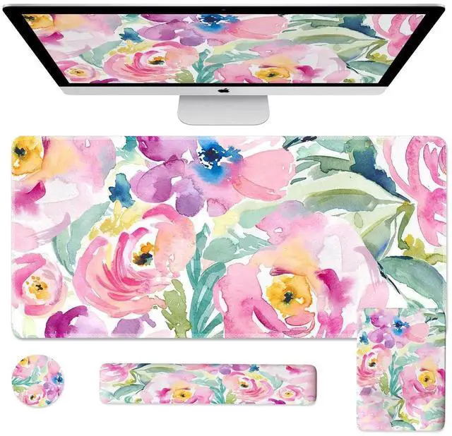 iCasso Mouse Pad with Wrist Rest, Large Desk Mat Set, Ergonomic Keyboard Pad with Wrist Support, Non-Slip Mouse Mat for Women, Cute Floral Computer Mat for Home Office Gaming (Watercolor Flowers)