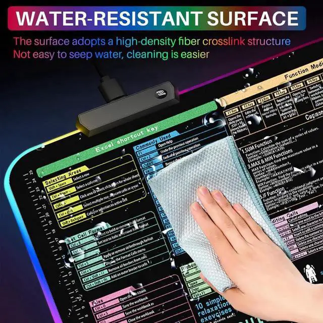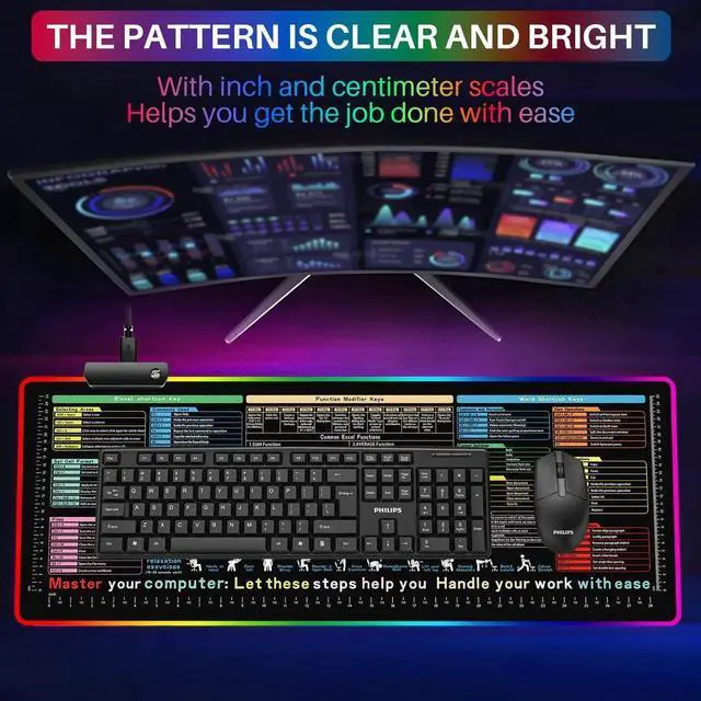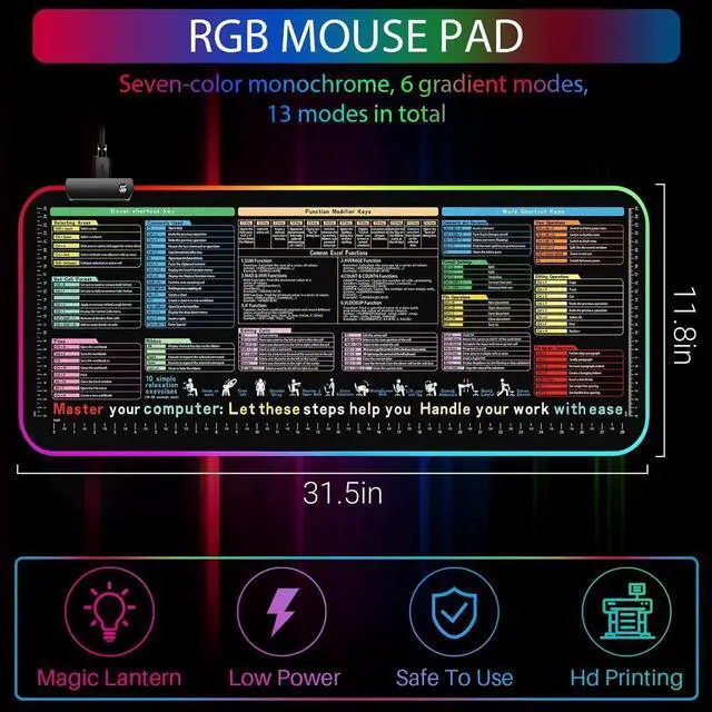 Sbarklo RGB Excel Cheat Sheet Desk Pad 31.5 x 11.8 with 13 Light Modes - Light Up Waterproof RGB Mouse Pad with Inch Scale, Contain 12 Types of Common Skill in Excel and Word, Excelpad XL Led Desk Mat