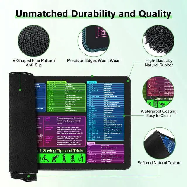 Large Excel Cheat Sheet Desk Pad, Cheat Table Gaming Mousepad, Over 150 Excel Shortcuts, Non-Slip Sewn Edge, Suitable for Office Use, Employee Appreciation Gift