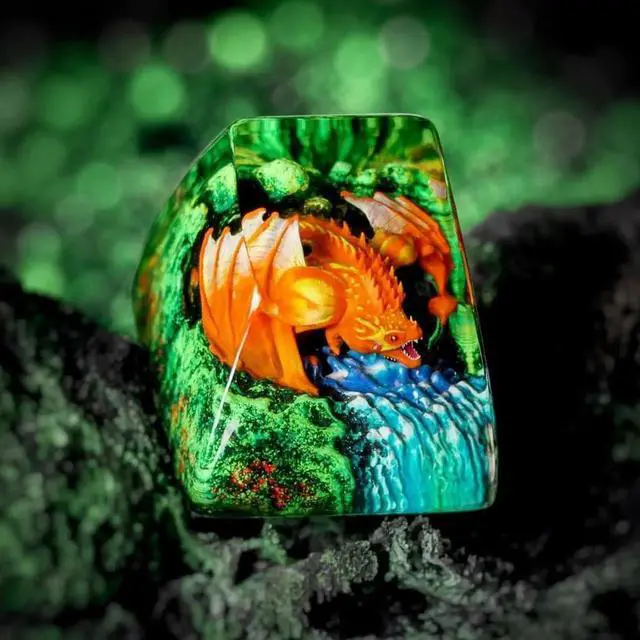 Orange Dragon with Waterfall Artisan Keycap R1 SA Profile Custom Fantasy Dragons Keycaps 1U ESC Handmade Gaming Resin Key cap Cherry MX Switch Compatible Mechanical Keyboard Gift for Dragon Lover