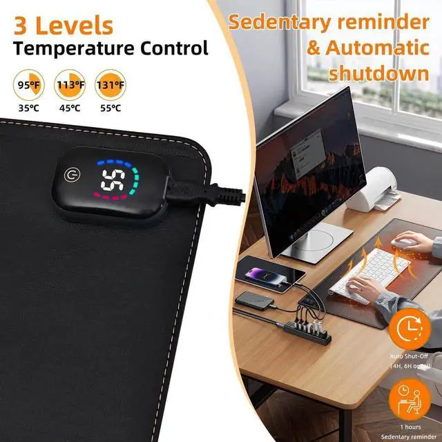 3 Levels Heating & Sedentary Reminder:This heated mouse pad has 3 heating temperatures 354555 (95, 113, 131) .The desk mat heats up quickly within 10-15 second. keeping your hands warm anytime, anywhere, improving work efficiency in the cold winter. After using the warm mouse pad for one hour, indicator light will flash 5 times to remind you to take a break.