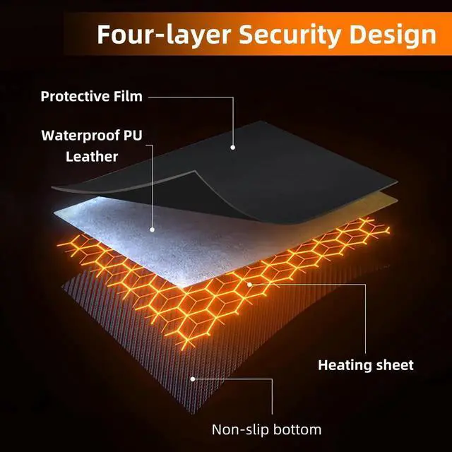 Safe&Quality Material:Heated mouse pad with 4-layer safety design consisting of protective film, waterproof PU leather, heating element, and anti slip bottom.The mouse pad is safety-certified(CE,FCC,UL).Warm mouse pad is equipped with an over current protection device to prevent electric shock.The heated Desk pad can protect your desktop from splashes, ink, and other liquids all the time.Easy to clean.
