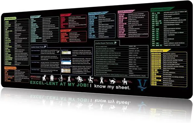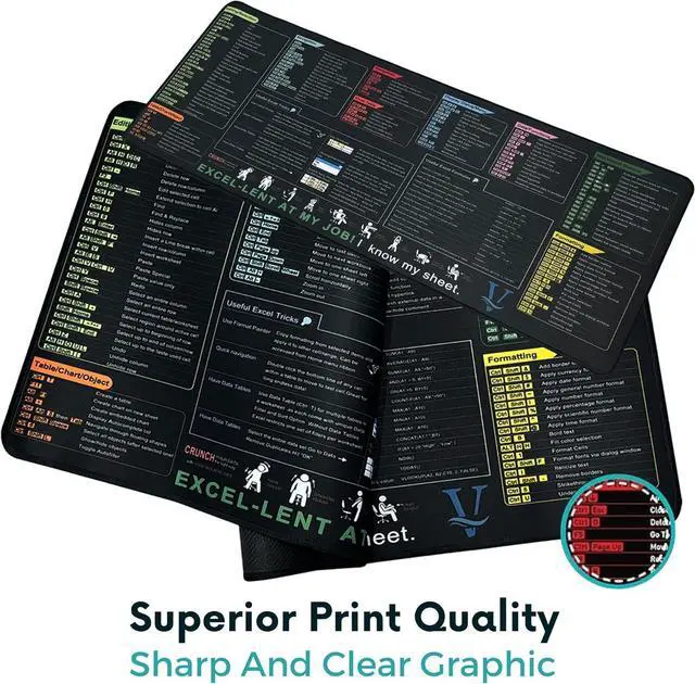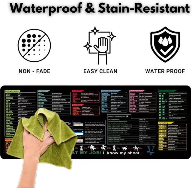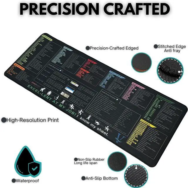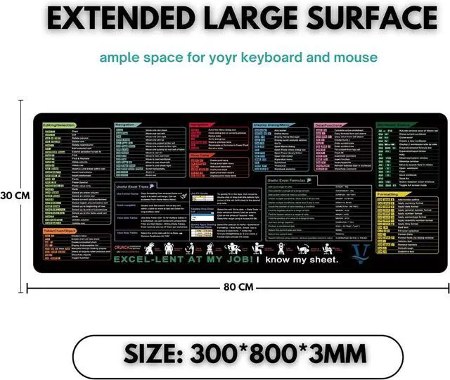 Size Maximize Desk Space: This oversized desk mat easily fits your keyboard and mouse providing a smooth and spacious surface for comfortable daily use.?? Printed Excel Shortcuts Work Smarter Not Harder: Features commonly used spreadsheet shortcuts printed clearly for fast access save time and increase efficiency with every task.?? Durable Locked Edges Built to
