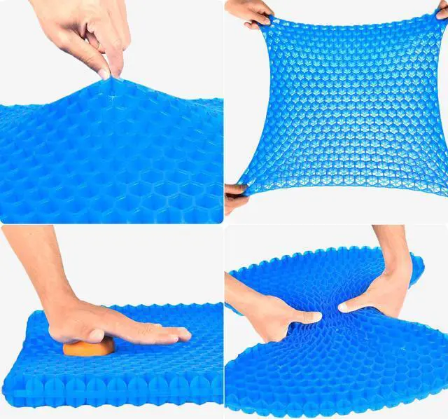 Large size & Help Relieve Paingel seat cushion size is 18.9 x 17.7 x 1.6 inch weight about 2.6 lb. Double-layer gel cushion design. Not only thicker but also more comfortable effectively prevent and alleviate various pain symptoms including tailbone problems lumbar strain sciatica and degenerative disc disease. Breathability and heat dissipationOur seat cushion adopt a honeycomb design and the built-in free-flowing air channel prevents the seat from sweating and maintains comfortable heat dissipation. Super soft & hard to deformThe gel cushion has cushioning property that it does not break even if you put an egg and sit down.