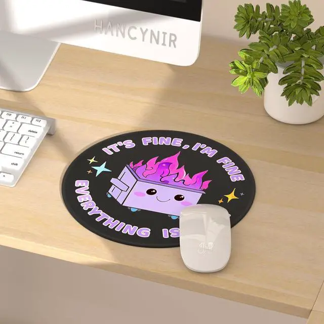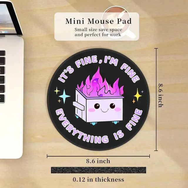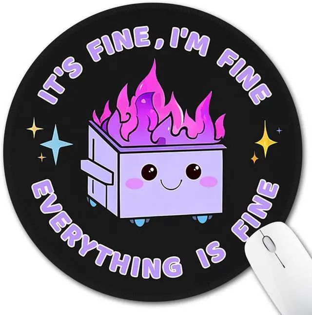 Awesome Mouse Pad Design - This purple mouse pad features a cute funny dumpster on fire pattern design: It's Fine I'm Fine Everything is Fine which will bring you more happiness while working studying or playing. The small mouse mat also fits all types of desktop keyboard laptop and wireless computer mouse. Perfect Size Mousepad - The round mousepad is designed for convenience and has an ideal size that fits perfectly on any desk or workspace measuring 8.6 × 8.6 × 0.12 inches (220mm x 220mm x 3mm). It is lightweight and easy to carry making it perfect for use at home in the office while gaming or while travelling. Super-smooth Surface - The surface of mousepad is made of high-quality Lycra cloth ensuring smoother mouse control and pinpoint accuracy. Optimised for mouse sensor designed for maximum control and precision. High Quality Material - The mouse pad is made of high-quality materials which can ensure durability and long-lasting use. It is suitable for all kinds of mouse laser and optical. For Loved Ones - This design of the mouse pads is personalized the color of the mousepad is as vivid as the pictures perfect for Christmas New Year Valentine's Day Mother's Day Father's Day holiday and birthday. It is also a great desk accessory for co-worker friends teammates employees students staff.