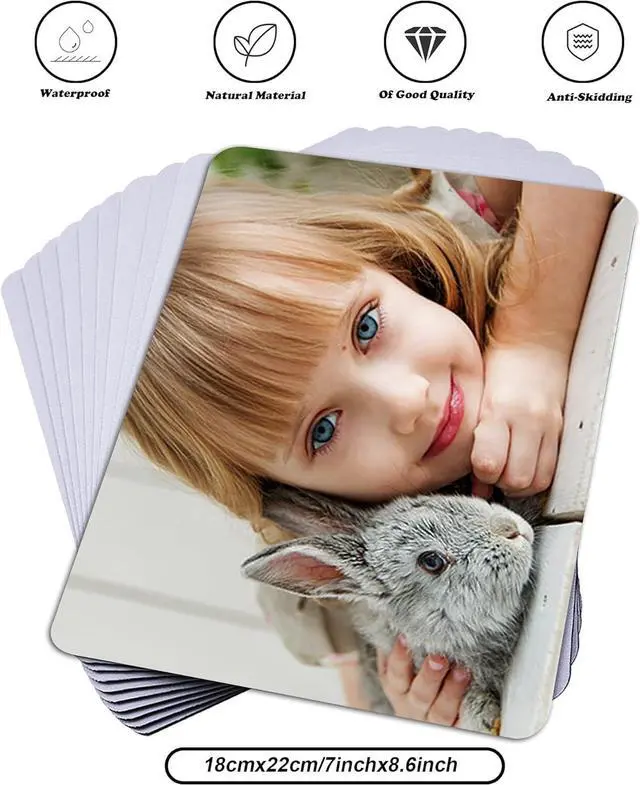 Color of Mouse Pad: WhiteThis blank mouse pad is fashionable and can be printed any personal photos company logos and other images you like for promotions gifts personal keepsakes artwork showcasing etc. They are ideal mouse pad for personalization. Effectively prevent accidental damage from spilled liquid. When liquid splashes on the pad it will form into water drops and slide down. Its easy to clean and will not delay your work or game. Anti-slip natural rubber base can firmly grip the desktop. Premium soft material for your comfort and mouse-control.