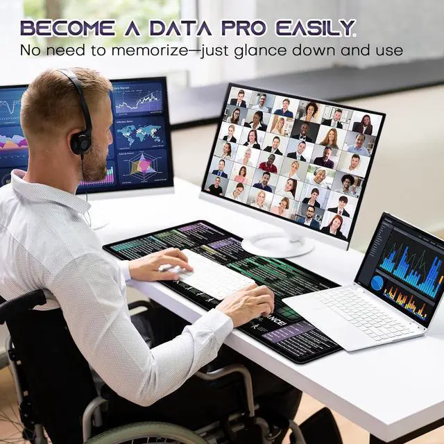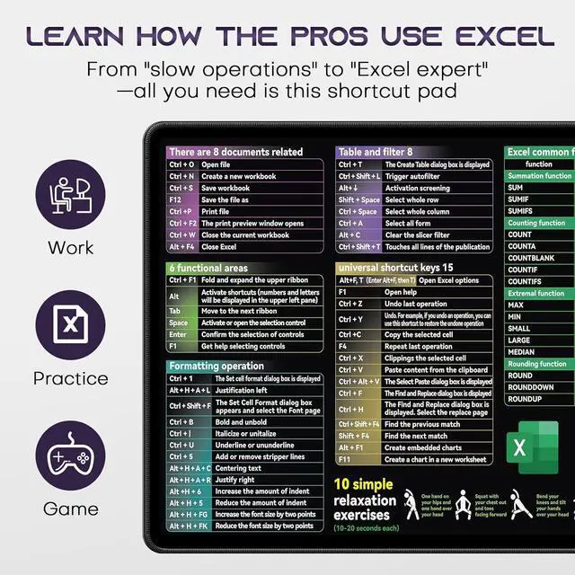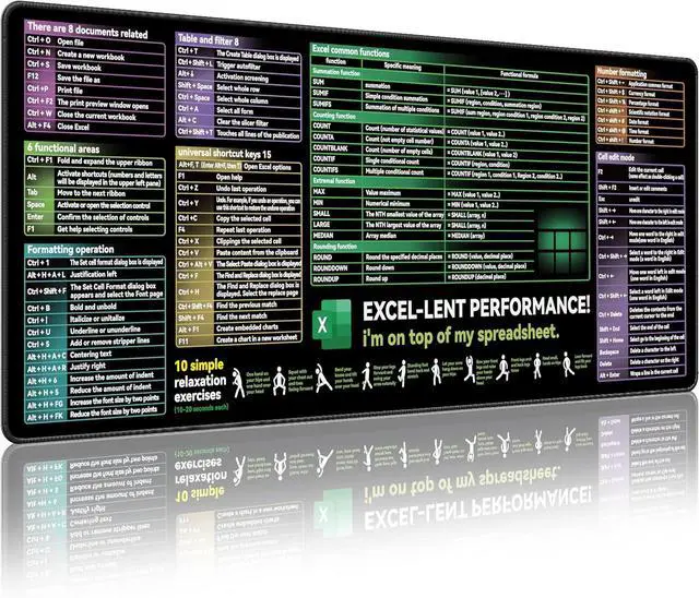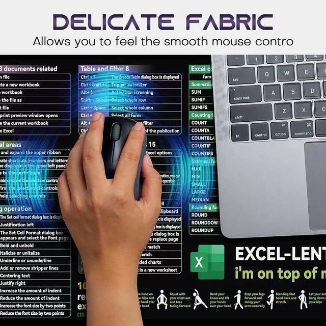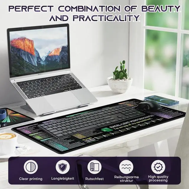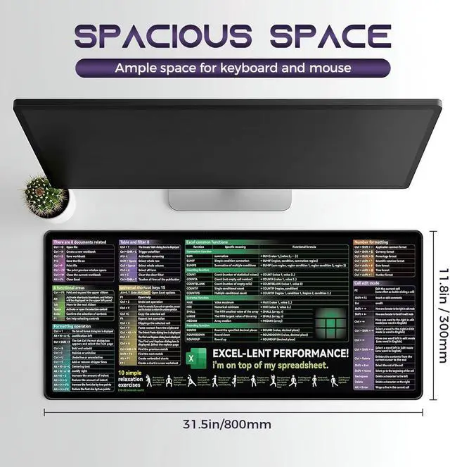 Useful shortcut keysContain Various excel cheat sheetfunctionYou can check it at any time while workingNo need to waste time searchingThis excel cheat sheet desk pad will help your work be easyClear and bright printingThis excel cheat sheet desk pad ues advanced inkjet printing technology makes the patterns clearer and brighter you can read them effortlessly! Smooth and waterproof fabricThis large desk pad is made of high-quality fabric which makes it waterproof easy to clean and smooth to use giving you a better use experience. Large coverage size 31.45 * 11.75 in large XL sizeIt can not only place your mouse and keyboard but also your documents cups and office suppliesThe large size can also protect your desk from damageDelicate seams and non-slip rubber bottomThis mouse and keyboard pad uses a double stitching process which makes the edge stitching more durable than traditional processes and will not fall apart.