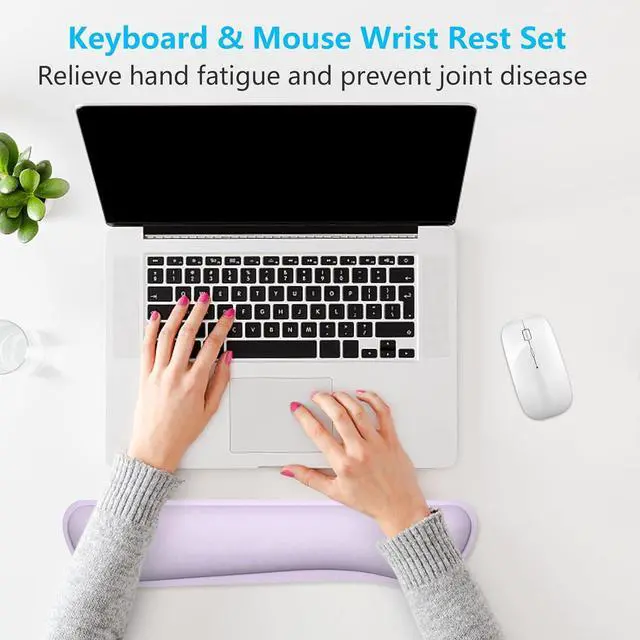 Memory Foam Wrist SupportMemory foam inside the keyboard and mouse wrist rest keeps your wrists lifted and supported in a comfortable way. get full support to distribute pressure and put angled up wrists naturallyErgonomic Wrist RestsErgonomical wrist-shape design perfectly fits to wrist and hand when put your wrist on the mouse wrist support improve hand and wrist posture release your elbows and shoulder stress for long hours of use on the computerNon-Slip Texture BaseDesigned with dense textured rubber provide heavy grip preventing sliding or unwanted movement for keyboard and mouse pads. Double Sticking & Press handing for edge to supply flat and smooth edge and will not roll up nor split openEnlarge Thicken Size17* 3.6 *1 inch keyboard wrist rest pad offers more support to your wrist Wrist rest works perfectly with most laptop computer keyboards &mice and save space for small deskWide ApplicationRelieve wrist pain when you gaming working study etc.