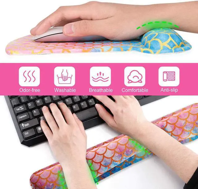 Comfortable & Ergonomic DesignOur keyboard wrist rest pad and mouse pad set is a great combination for computer laptop users. The wrist support mouse keyboard pad is designed to provide a soothing sensation and relaxation while typing maintain wrist comfort and normal circulation of the blood. Keep arms wrists and hands from getting sore while using the computer maximum reduce wrist stress and tiredness. Prevent the wrist from pain syndromes such as Carpal Tunnel and RSI effectively. Superb QualityThe mouse and keyboard wrist rest pad is lightweight comfortable and durable for your daily work or life.