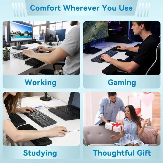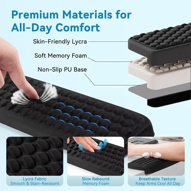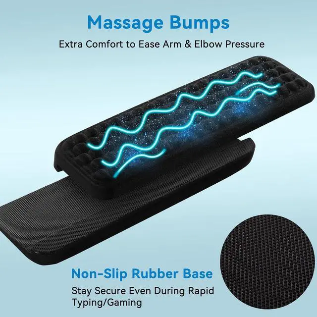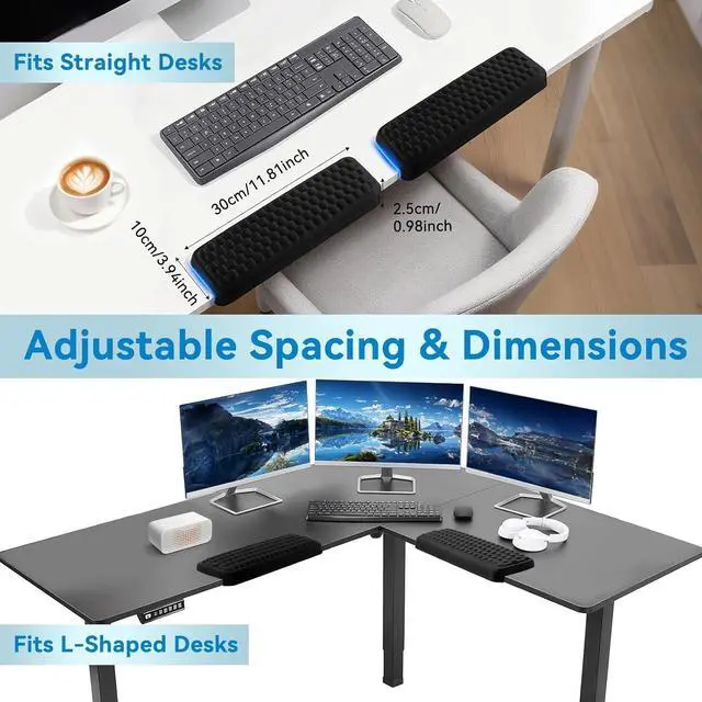 Ergonomic L-Shaped DesignPerfectly fits the desk edge offering comfortable support for arms and elbows reducing pressure and discomfort during long work hours and effectively relieving pain. Adjustable Two-Pad SetEach pad measures 14.9 x 3.5 x 0.6 with freely adjustable spacing to fit various desktops helping you say goodbye to fatigue. Massage Pattern + Memory FoamUnique massage patterns soothe hands; slow-rebound memory foam combined with breathable fabric ensures long-lasting comfort without stuffiness. Stable Installation2 L-shaped elbow pads feature a secure design that stays firmly in place without damaging the desktop ensuring worry-free use. Non-Slip BaseStrong rubber base keeps the pads firmly in place even during intense operations offering peace of mind for work and gaming.