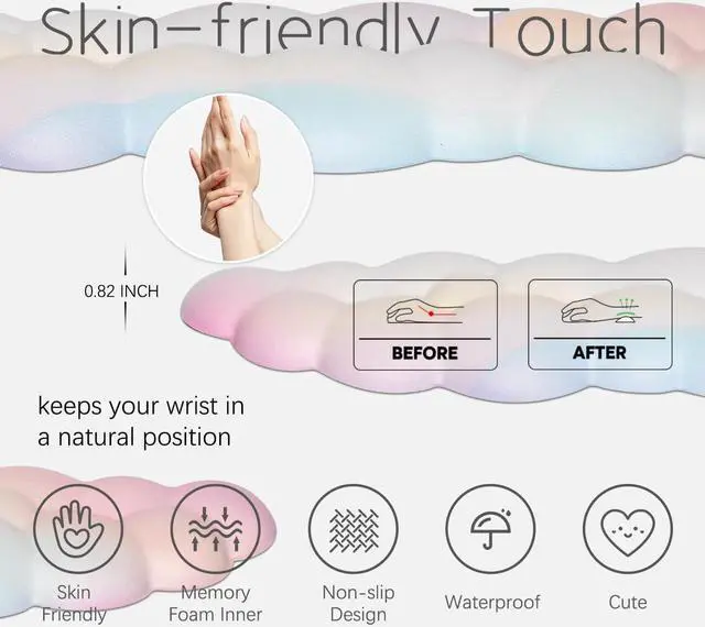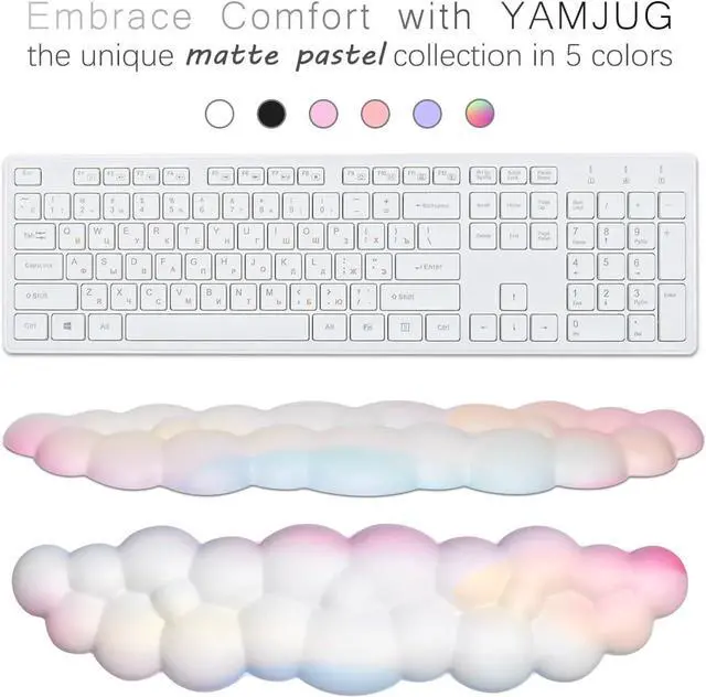 High-Density Premium Memory FoamOur cloud keyboard wrist rest is made with premium memory foam slow bounces back and durable. Fits the length of the keyboard providing support and cushioning for your wrists during long hours of typing or gamingErgonomic DesignThe comfortable cloud wrist rest is ergonomically designed to promote a natural and comfortable hand and wrist position while typing. Soft-touch breathable material provides a better fit and allows for proper air flow reduce the discomfort caused by sweating even in hot summer months4-In-1 Cloud Computer AccessoriesThis stylish gift box includes a cloud keyboard wrist a cup pad and a cute mouse pad with wrist and available in five stylish colors for your choice the waterproof leather covering that is not only durable but also easy to cleanSkin-friendly ComfortableThe combination of the premium memory foam and the breathable material creates a luxurious and enjoyable typing experience It is the perfect partner for your work and game allowing your hands to enjoy the cloud at all times and start a comfortable journeyNon-slip PU BaseAfter you remove the plastic backing the non-slip PU base keeps it firmly in place on your desk preventing any unwanted movement or sliding.