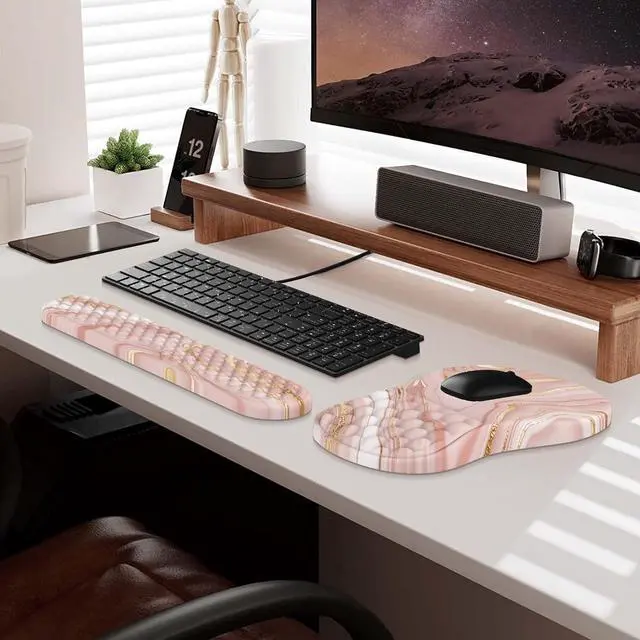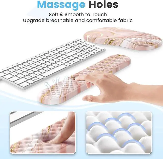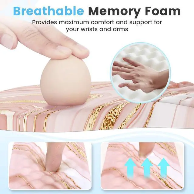 Improved Ergonomic Design: The rose gold mouse pad with wrist rest and wrist pad for keyboard adopts 100% memory foam. Not easy to deform or infiltrate over time like a gel. 8-degree slope keep wrist maintaining in proper alignment. The wrist can be fully supported on the arched part. Feel like on a comfortable pillow. Reduce wrist pressure and avoid carpal tunnel painMassage