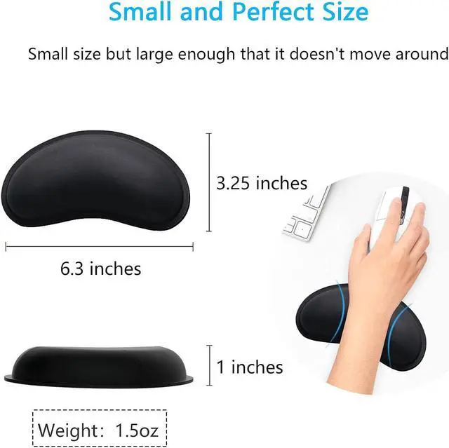 Perfect Size: Mouse Wrist Rest Pad measure 6.3 * 3.25 *1 inch. Perfect size for limited space and keyboard tray Lightweight and easy for carrying outside. Fits perfectly in office home travel and coffee shopsMultifunction: The mouse wrist support is not only can be used as mouse wrist but can be used as the keyboard wrist rest pad. Rest your elbows on a mouse cushion instead of the desk relaxing and comfortable to use