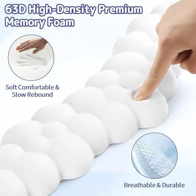 Soft & Slow Rebound SupportMade with 63D high-density memory foam this ergonomic cloud keyboard wrist rest offers soft yet supportive cushioning for long hours of typing or gaming. The slow rebound design gently adapts to your wrist's shape encouraging a more natural posture and enhancing overall comfortErgonomic Meets AdorableThis cloud-shaped keyboard cushion is carefully contoured to support the natural curve of your wrist offering both comfort and charm. Its cute cloud-inspired silhouette adds a playful touch to any setup suitable for cute desk decor cozy study spaces or stylish workstationsNon-Slip Base for StabilityEquipped with a non-slip PU base the cloud hand rest stays firmly in place even during fast-paced work or intense gaming sessions.
