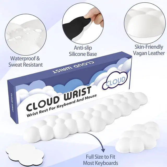 Enjoy smooth mouse tracking and steady typing without unwanted shifting3-in-1 Cloud Desk SetThis 3-piece cute desk accessory set includes a keyboard wrist rest a matching mouse wrist rest and a cloud-shaped coaster. Designed for both function and aesthetics it's a thoughtful office gift for family friends and teachers or coworkers who want to add comfort and style to their workspaceWaterproof & Easy to Clean Made from water-resistant and sweat-proof vegan leather this cloud arm rest set is built to handle everyday spills and sweat. Its smooth wipeable surface makes cleanup effortless helping you maintain a neat hygienic and low-maintenance workspace with ease