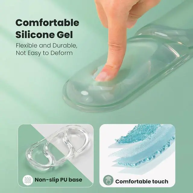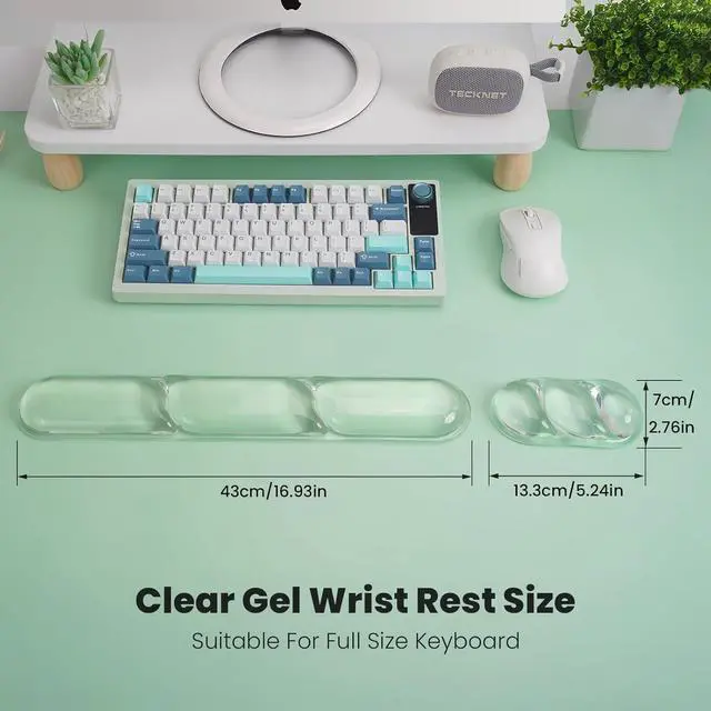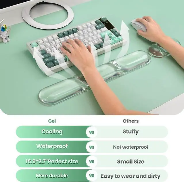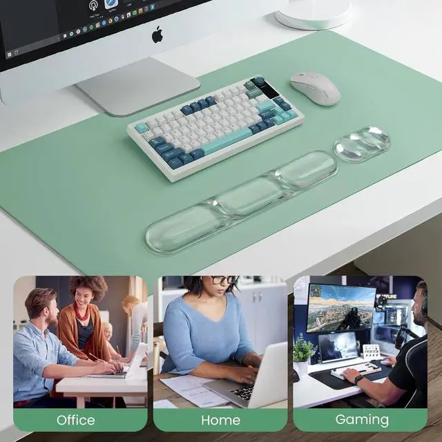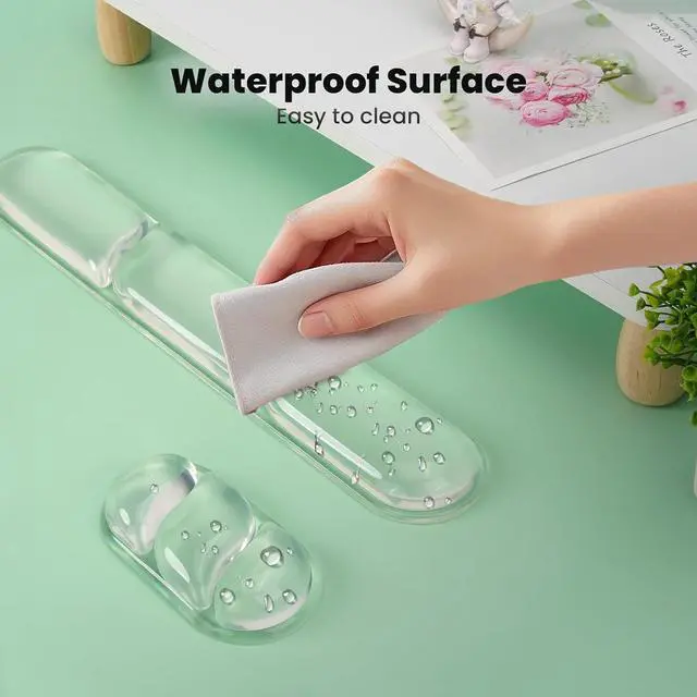 Ergonomic Clear Gel Wrist Rest SetThis gel keyboard wrist pad provides perfect ergonomic support for your wrist fitting snugly around it to deliver ultimate comfort and support. Using our computer wrist support can effectively relieve wrist discomfort and pain helping to protect your wrist during long periods of typing or gaming. Premium Silicone Gel Keyboard Wrist RestThe laptop wrist rest is made of premium silicone with soft and comfortable silicone gel filling inside that provides excellent support and does not deform easily. At the same time the wrist rest adopts a 3-section design with appropriate gaps to maintain air circulation and prevent your wrist from feeling stuffy.