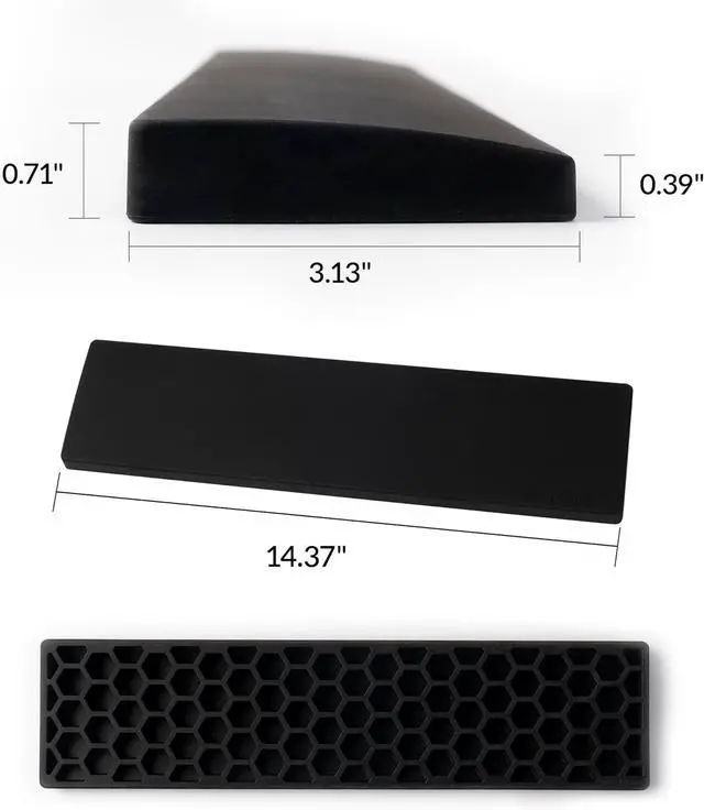 Tip: Silicones natural grip may attract dust or lint. To clean rinse with warm water and wipe with a soft lint-free cloth. For a softer less tacky touch gently pat the surface with a clean dry cloth to refresh its feel. This simple step can help maintain a smooth resting experience especially after extended use or exposure to humidity and dust. Stable Base -The computer keyboard wrist rest is made of high-quality silicone material. The honeycomb non-slip base provides strong suction to keep the wrist rest firmly fixed on the desktop preventing any sliding or unnecessary movement. Ergonomic Support - Designed to complement your keyboard's ergonomic angle the palm rest provides an edgeless feel and reduces wrist strain. Soft silicone paired with a honeycomb pattern absorbs pressure and impact delivering extra cushioning and support during long typing or gaming sessions.