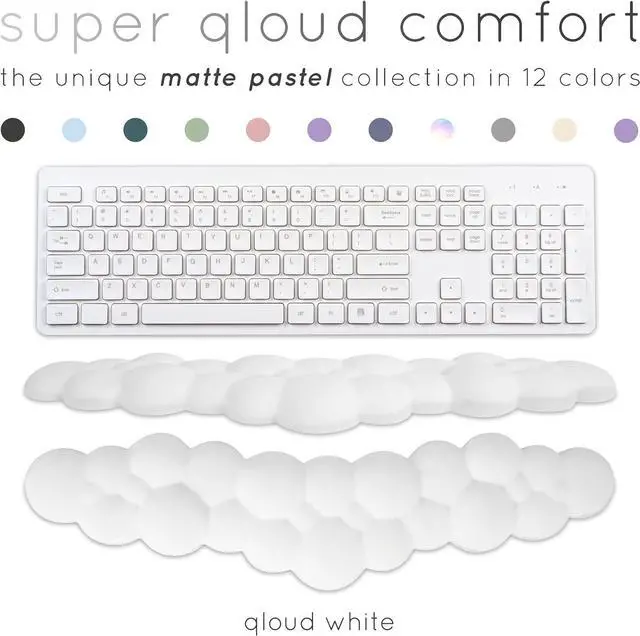 The height and length of the wrist pad for keyboard rest makes it suitable for all types of keyboards including laptopsPersonalize Your Space Now available in 12 pastel colors the Qloud wrist support for keyboard will compliment any desk setup. The arm rest for desk also features a non-slip base to make it suitable for any type of work environment with no unwanted movement. Make your desk stand out with the Qloud wrist rest for keyboard and mouse and work or game in comfort and style3 in 1 Cloud Computer Accessories This beautiful gift box includes a keyboard wrist pad mouse pad wrist support and a cloud mouse pad.