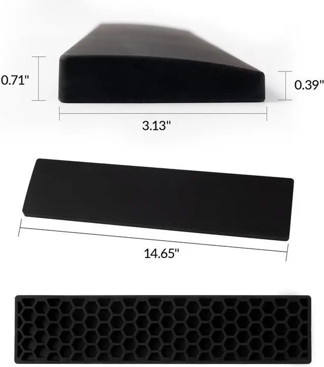 Secure Non-Slip Base: The textured honeycomb base ensures a strong grip on your desk keeping the palm rest firmly in placeeven during fast-paced work or gaming. Ergonomic Support - Designed to complement your keyboard's ergonomic angle the palm rest provides an edgeless feel and reduces wrist strain. Soft silicone paired with a honeycomb pattern absorbs pressure and impact delivering extra cushioning and support during long typing or gaming sessions.