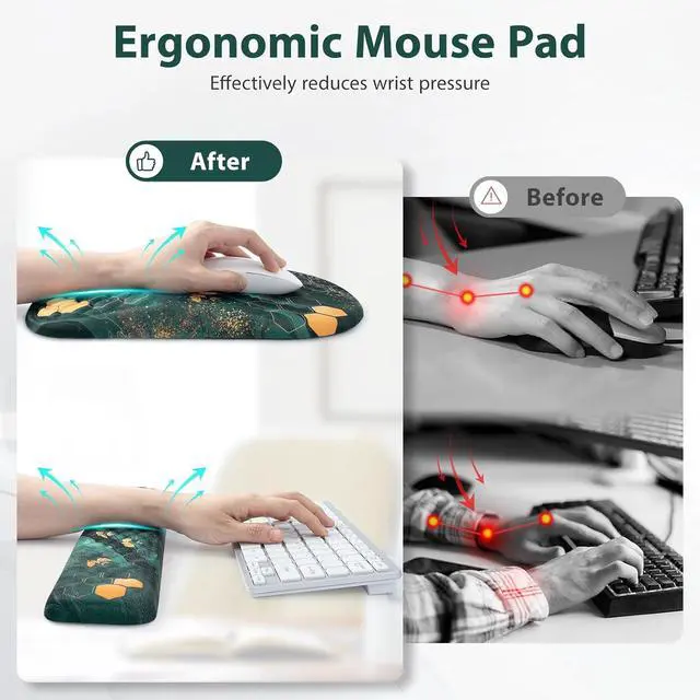 Ergonomic Support These mouse pad with wrist sets feature an ergonomic design with a 10.8 degree slope promoting proper wrist alignment to reduce pressure and prevent carpal tunnel pain. Massage DesignBumpy massage bead design on the desk mouse pad and keyboard wrist rest improves blood flow and air circulation offering enhanced comfort during extended use. Non-Slip BaseWrist pad for keyboard with non-slip PU base provides enhanced stability on various surfaces preventing the keyboard from sliding or accidentally moving on the desk. Smooth ExperienceSmooth lycra fabric surface for more accurate mouse movement and precise mouse control. High-definition bright print patterns are easy cleaning and aesthetic.