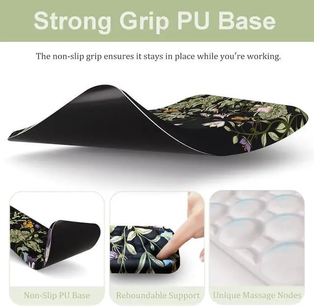 With this added feature you can work or play for longer periods of time without experiencing discomfort or fatigue. Anti-Slip PU BaseOur mouse pad and keyboard wrist rest have an anti-slip PU base that ensures stability on any surface unlike rubber bases. Whether you're working at a desk on a bed or even on a couch the pad will stay firmly in place allowing you to work comfortably and efficiently. Perfect Size The keyboard wrist rest measures 17.4 x 3.14 x 0.94 inches while the mouse pad wrist support measures 12.12 x 8.11 x 1.18 inches.