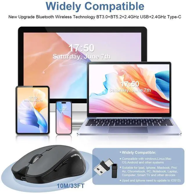 | Special Feature | Bluetooth 5.2 & Bluetooth 3.0 Switched Freely, Dual Mode Switching & Adjustable DPI, Ergonomic Design & Lightweight Portable, Precise Optical Tracking & Rechargeable, Wireless 2.4GHz USB-A & 2.4GHz USB-C [Type-C] Receiver Plug-and-play |
