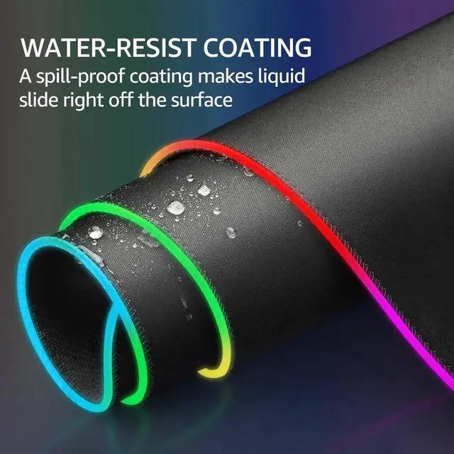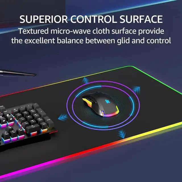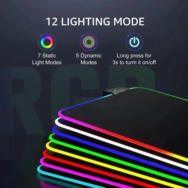 12 RGB Lighting Modes: This RGB gaming mouse pad features 12 lighting modes: 7 static light modes and 5 dynamic mode. Its powered by a discreet braided cable that can be detached. It also features a low-profile button which allows you to cycle through effects on the fly. 31.5 x 11.8 inches Extended Size: This X-Large mouse pad is large enough to fit your gaming mouse, full size mechanical keyboard and other desk items. Keep a clean, uncluttered desk. Play with the freedom to configure your setup anyway you want. A perfect gaming mouse pad for those who use a lower DPI or just like to have more room to maneuver. Highly Durable Design: Frayed edges and low-quality materials are problems many gamers are familiar with. The anti-fray mousepad addresses these issues with an advanced cloth textile chosen only after countless hours of testing. Stitching along the edges of the surface ensure it will never fray or peel. Superior Control Surface: extended mouse pad adopts textured micro-weave cloth surface on cover with enhanced command to provide the excellent balance between glide and control. The performance-tuned surface optimizes mouse tracking accuracy for both optical and laser sensors. Non-slip Rubber Base: The soft and dense non-skid nature rubber base keeps this desk pad firmly in place. This large mouse mat remains uniformly flat even over imperfect surfaces. Just immerse into your work or games without worrying about the annoying mouse pad movement.