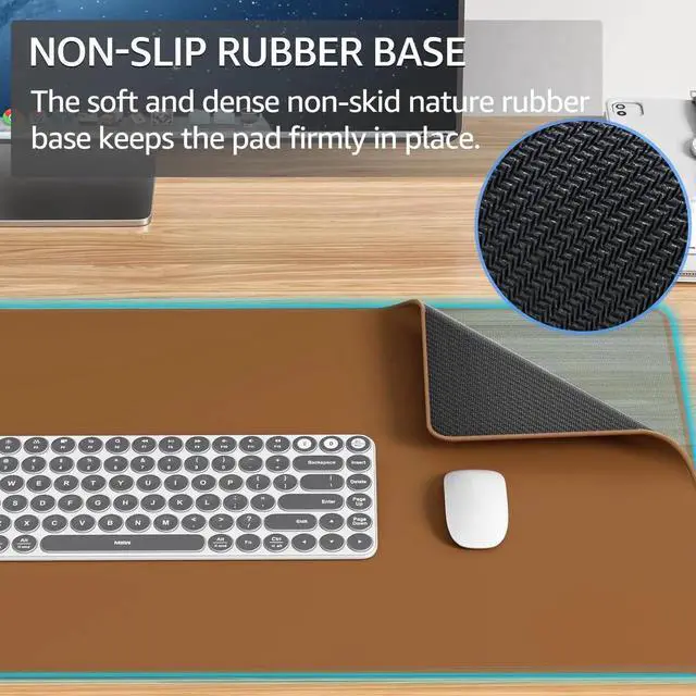 Non-slip Rubber Base: The soft and dense non-skid nature rubber base keeps this desk pad firmly in place. This large mouse mat remains uniformly flat even over imperfect surfaces. Just immerse into your work or games without worrying about the annoying mouse pad movement.