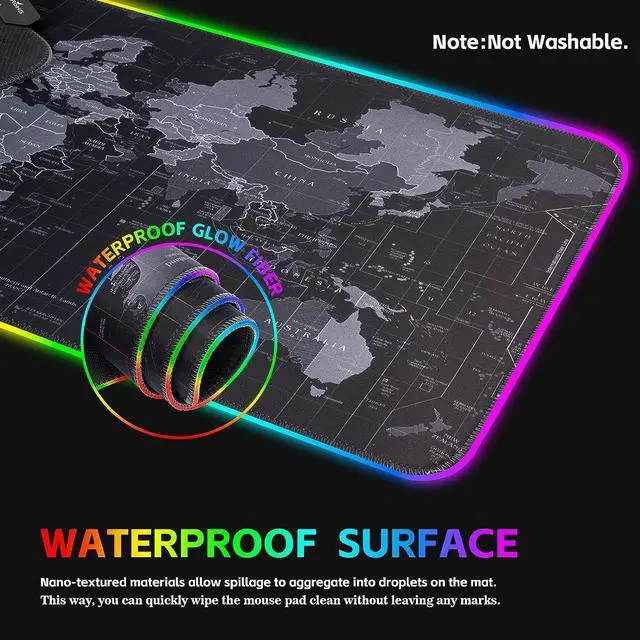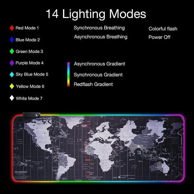 Light Up Your DeskRGB gaming mouse pad features 14 lighting modes includes 7 static modes and 4 dynamic modes. The super glow fiber functionality provides a fantastic RGB backlit effect softly glowing on the desk and creates an exceptional gaming environment. This LED RGB Mouse Pad can create a cool gaming atmosphere through Choosing the color mode. Ultra Smooth & Top QualityThe RGB Gaming Mouse Pads design with superfine fiber braided material which are micro-textured smooth surface so the mouse could moves seamlessly across the pad and then the cursor follows the mouse precisely. The Non-slip Rubber Base keeps the gaming mouse pad griping the desktop firmly.