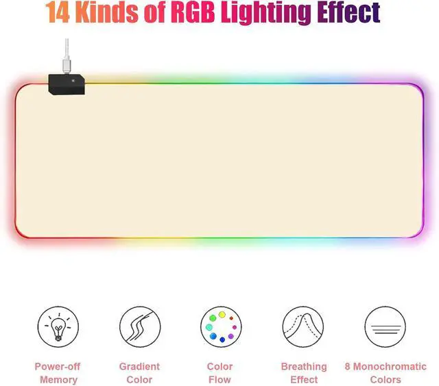 RGB lightingthis gaming mouse Pad has 14 lighting modes. 7 static light modes alternating Wave synchronizing Wave alternating flash alternating red changing lights off synchronize breathing Alternate breathing. It's not too distracting when you're playing/working. High quality materialnatural rubber textured underside stays stable. It also comes with a texture what enhances this ability even further. Gaming mouse Pad that will rest firmly on your desk even during the most intense gaming session. The extended mouse pad features a smooth textile-weave design for extremely precise mouse control and a smooth glide. Large sizemeasuring 800 x 300 mm/ 31.