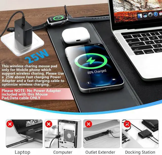3-in-1 Wireless Charging Mouse Pad-Fast Charging Mouse Pad offers 15W wireless charging for smartphones 5W wireless charging for earphones 2.5 w charging for smartwatches. It compatible with iPhone 16/15/14/13/12/11/X/8 series; Galaxy S23/S22/S21/S20/S10/S9/S8/Note 9/8; Airpods 4 with ANC/3/2/Airpods Pro 2nd/Airpods Pro and all other Qi-enabled devices. Whether you're at the office home or on thego our Charging Pad ensures efficient and convenient charging for all your devices. Attention-This wireless charing mouse pad only for Mobile phone/Device which support wireless charing. Please Use a 25W above Fast charging Power Adapter and a fast charging cable to optinnize wireless charging???.