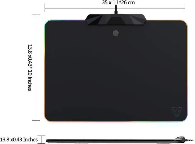 RGB Backlit Mouse Pad10 lighting modes Touch keys can adjust the lighting effect cycle. Choose from 6 solid colors (Red Pink Blue Green Orange Green grass) or the streamlining horse Racing spectral cycle dynamic effects or touch off the lights easily match the RGB lighting effects with your gaming mouse and gaming keyboardHard Waterproof SurfaceFeatures a fine resin surface texture material to provide comfortable touch feeling. The hard high precise micro-textured finish that ensures pinpoint accuracy and sensitivity speed a reinforced braided cable also pretty easy to clean. This fabric is extremely durable it will last for a decadeEasy and ConvenientThis backlit mouse pad is powered by USB and requires no driver to work.