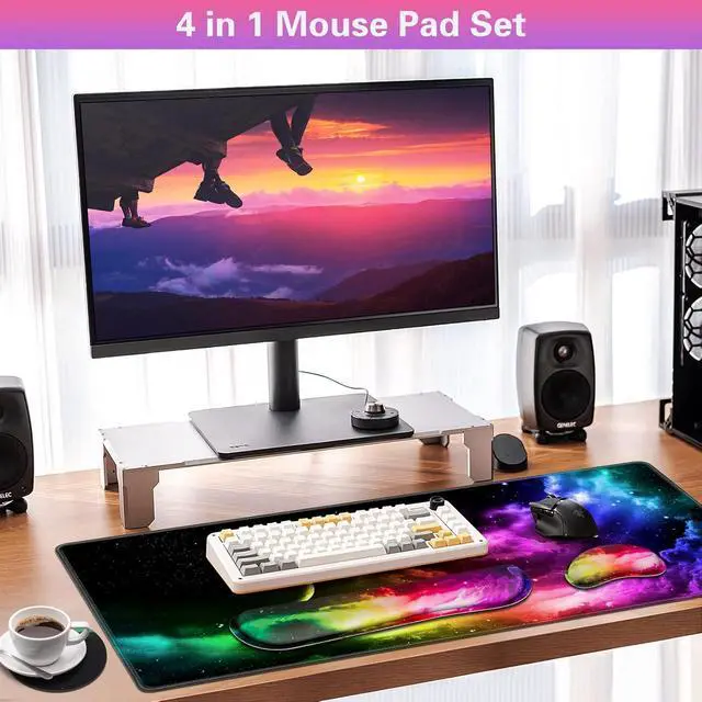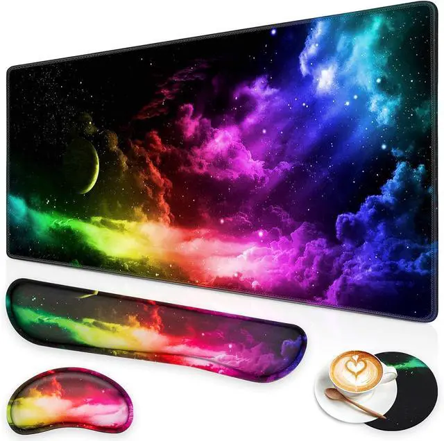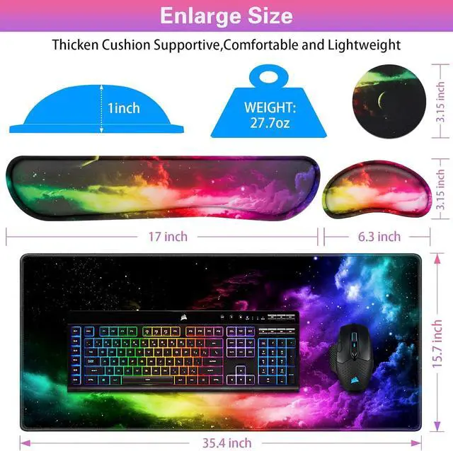 4-in-1 Mouse Pad SetOur large gaming mouse pad wtih wrist rest support set includes desk pad ( 35.4 x 15.7 inch) keyboard wrist rest( 16.9 x 3.54 inch) mouse wrist rest( 6.3 x 3.1 inch) coaster( 4.75 x 4.75 inch). The xxl large mouse pad is large enough to accommodate a full size keyboard and mouse providing ample space for games or office work and keeping the table clean and tidy. Exquisite AppearanceCanjoy desk pad for keyboard and mouse using advanced printing technology desk pad set has clear patterns bright colors exquisite patterns bring a sense of relaxation when your the body and mind are exhausted.