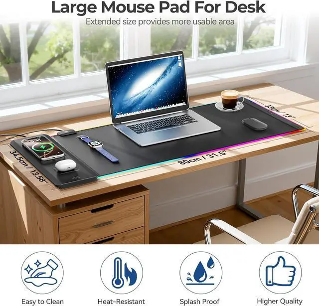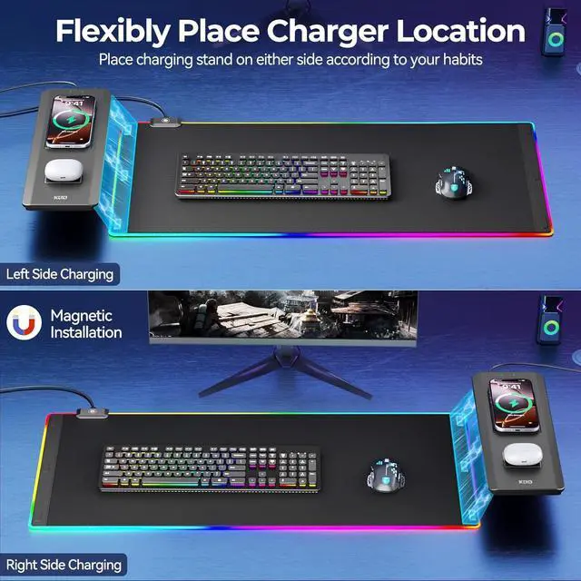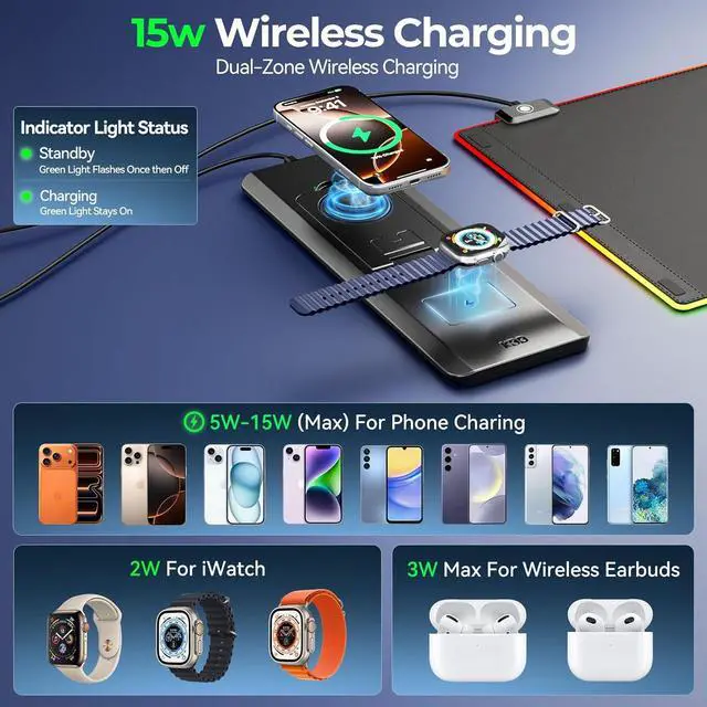 Dual Wireless Charging Zones - Our RGB gaming desk mat features 5-15W fast charging zone for phones 3W zone for earbuds or 2W for watch charge two devices at once without extra cables keeping your desk neat. Compatible with iPhone 16/15/14 Sam-sung S23/S22/S21 Air-Pods 4/Pro3 iWatch Series/SE and all Qi-enabled devices.