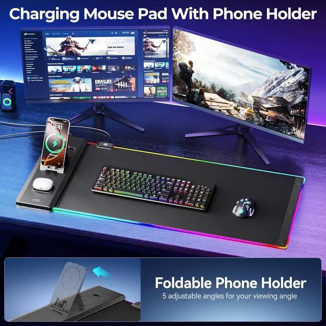 (NOTE: 15W need power adapter 9V 2A but power adapter is not included)RGB Desk Mat with Phone Holder - Our Keyboard mat mouse pad supports multiple lighting modes offering 14 switchable lighting modes including static and dynamic lighting effects. Use the RGB mouse pad to create a unique atmosphere while gaming or working. The unique foldable phone stand design keeps your phone within easy reach for gaming video calls or multitaskingUltra-Smooth & Non-Slip - The gaming mouse mat pad features premium woven fabric ensures precise mouse tracking and effortless glide. Non-slip soft dense rubber base keeps the computer pad mat firmly in place during intense gaming. Reinforced stitched edges resist fraying peeling and wear for long-lasting durabilityLarge Size Desk Mat - The mouse computer desk pad measures 27.56 x 13 inches accommodating gaming mice full-size mechanical keyboards and other desktop items providing ample space for work or gaming. Effectively protects your desk surface from scratches stains liquid spills high temperatures and wear and tearGaming Desk Accessories - The computer keyboard mat is an ideal gift for gamer loved ones friends leaders and more perfect for enhancing gaming accessory settings. Mousepad Keyboard mat powered by USB and wireless charging powered by Type-C plug and play.