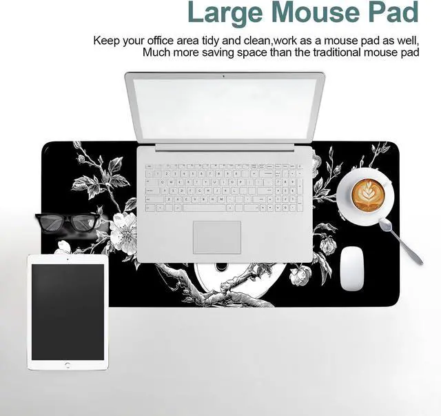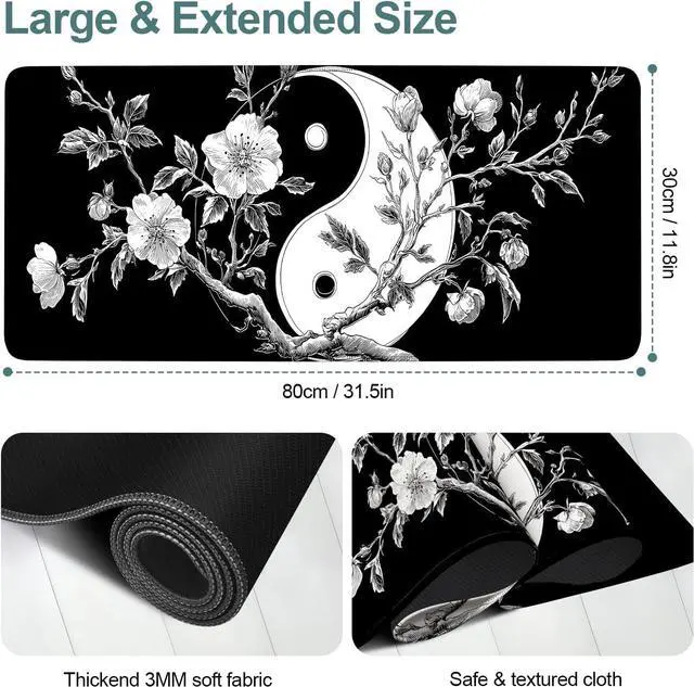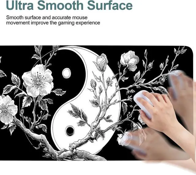 Full Desk Coverage: Our XL gaming mouse pad measures 31.5 x 11.8 inches (80 x 30 cm) providing plenty of space for your keyboard mouse and other desk accessories. The extended design keeps your setup organized and is perfect as a large desk mat extended mouse pad or keyboard mouse pad for gaming and office use. Artistic Black & White Yin Yang Design: Featuring a striking yin yang floral pattern this mouse pad blends traditional oriental aesthetics with modern style. The high-contrast black and white artwork adds a unique visual touch to any gaming setup computer desk or home office workspaceSmooth Surface with 3mm