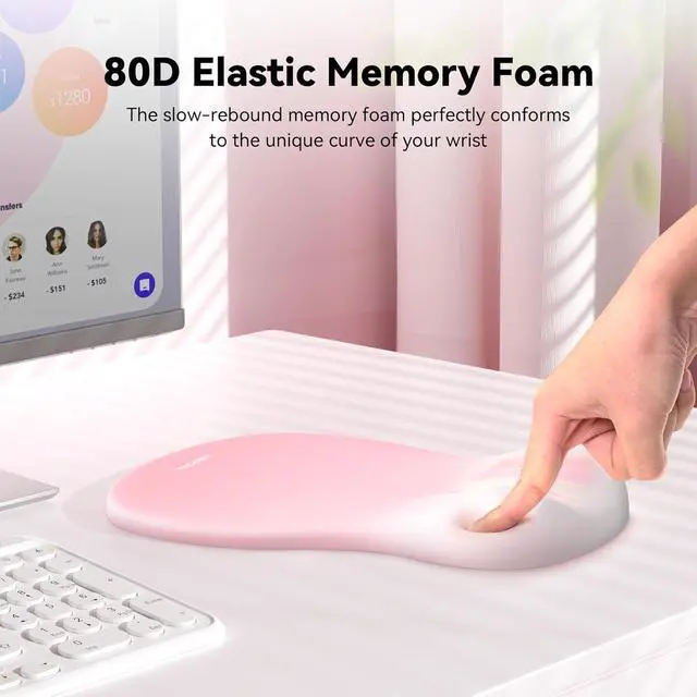 Ergonomic Concave Design Mouse PadThis ergonomic mouse pad features a scientifically designed concave shape that conforms to the natural curve of your wrist lifting and supporting it to effectively distribute pressure and significantly reduce fatigue from prolonged use. Whether you're working or gaming this mouse pads will helps you maintain a relaxed and natural grip enhancing comfort. One-piece 80D Elastic Memory Foam Mouse PadsThe mousepad with wrist rest is filled with high-density memory foam in every corner which is is soft and sensitive to the touch and gently conforms to the shape of your hand. The mouse wrist rest is provides cloud-like comfortable cushioning while maintaining excellent resilience always keeping its shape and providing stable and lasting support.