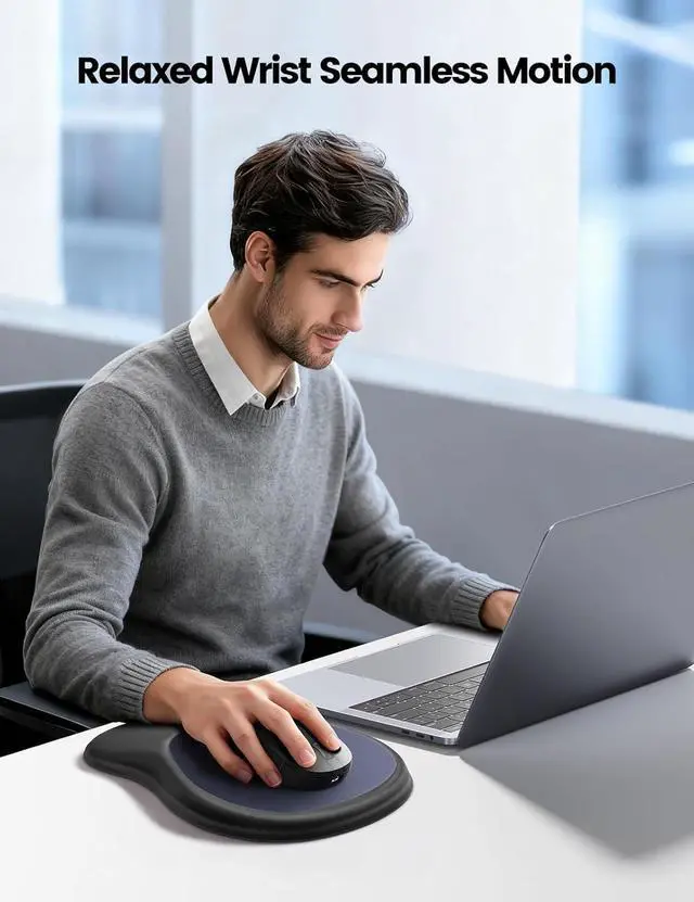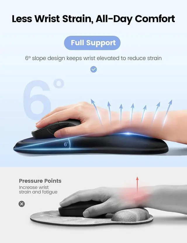 Larger size of the mouse pad with wrist rest offers plenty of space to move your mouse freely. Ergonomic Wrist SupportWhether you're typing up reports or diving into a game your wrist deserves a break! Featuring 6° gradual slope design the memory foam wrist rest gently supports your wrist at the perfect angle allows your hand to rest in a natural relaxed position helping to relieve pressure reduce fatigue and prevent carpal tunnel syndrome. Anti-Slip Base for Firm GripThe textured rubber base keeps the mouse pad with wrist support firmly in place even during intense workloads.