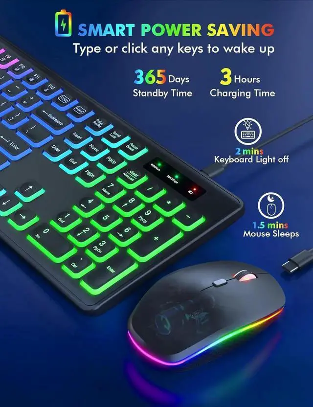 Rechargeable keyboard and mouse can be charged by supplied USB C charging cable. The smart auto-sleep function and on/off switches help you to save power. Leave for 30 mins, the keyboard goes to sleep, leave for 90s, the mouse will sleep.