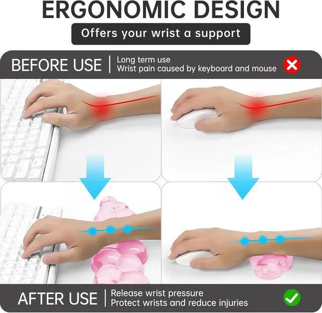 Functional Gel: This clear keyboard mousepads with wrist support features breathable and cool texture. Its smooth surfaces is resistant to dirt sweat and water. It's durable to use. You can simply clean it easily to meet your daily office or gaming demandsNon-Slip