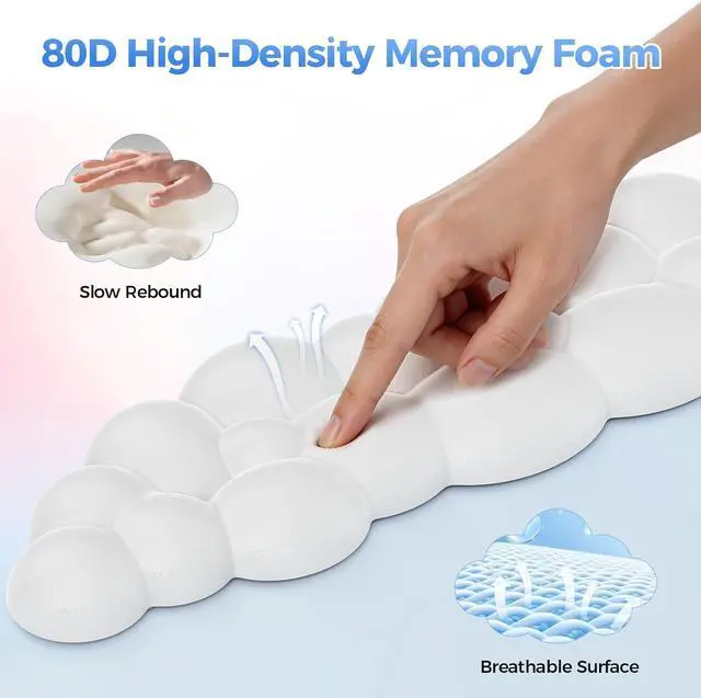 Ergonomic Cloud Mouse Pad and Wrist RestThis mouse pad and keyboard wrist rest features a sleek cloud-shaped design providing comfortable ergonomic support. Its unique cloud shape naturally conforms to your wrist promoting a relaxed and natural hand posture perfectly matching the natural curve of your wrist. The textured surface of this wrist rest for computer keyboard helps with air circulation keeping your wrist dry even in hot and humid weather. Comfortable Memory Foam FillingThe mouse pad with wrist support is filled with high-quality slow-rebound memory foam providing superior comfort and support evenly distributing pressure. The keyboard wrist rest and mouse pad set is soft and comfortable to the touch and resists deformation ensuring you enjoy lasting comfort during work or gaming helping you stay focused and productive.