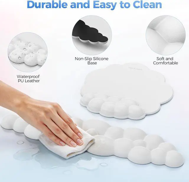 Waterproof Surface & Non-Slip BaseThis cloud wrist rest for keyboard and mouse is designed for durability and stability featuring a durable waterproof surface that easily withstands spills moisture and sweat making it easy to clean and maintain. The mousepad with wrist rest's non-slip rubber base ensures it stays firmly in place on the desk preventing it from sliding or shifting during use. Optimal Size & Universal FitThe set includes a 16.93 x 4.72 x 0.79 inch wrist support for keyboard and a 10.43 x 9.84 x 0.9 inch mousepad with wrist rest. This mouse pad wrist support features an ideal height and length suitable for all sizes of keyboards and mice and perfectly complements various desktop setups.