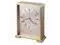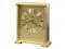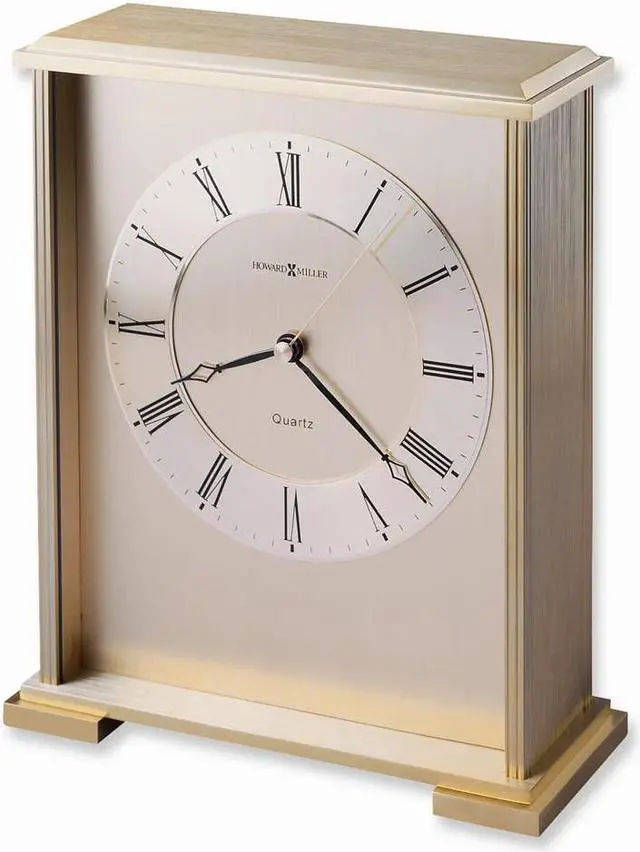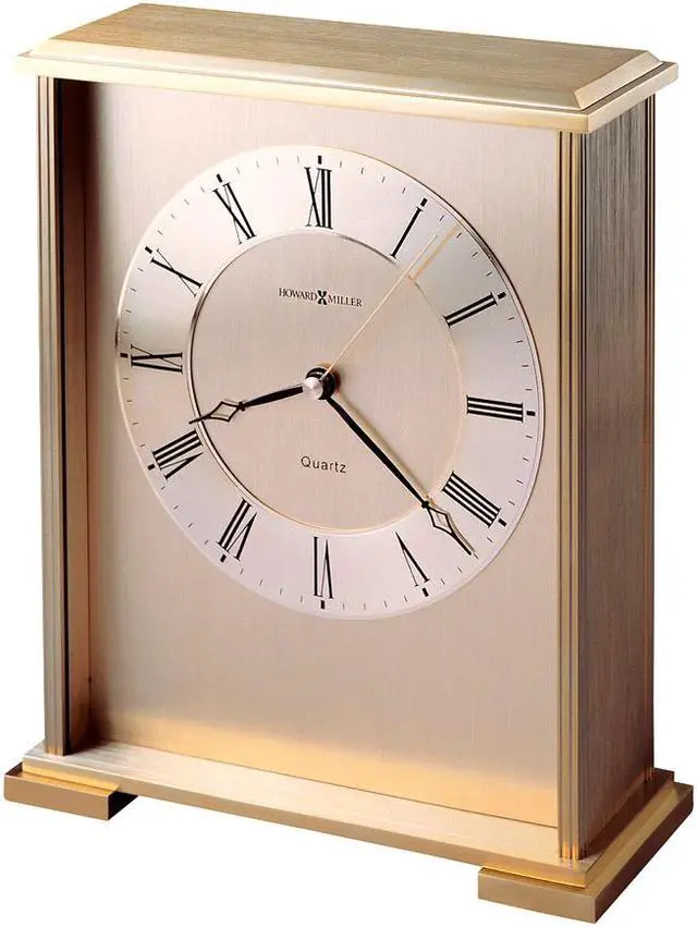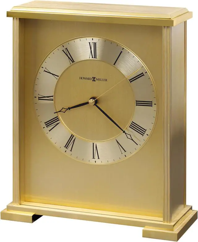 This attractive, classy clock is set in a polished and brushed brass frame, and will look great on any table, mantle, or shelf. The hands are formed in a cut iron diamond shape, and feature a single gold hand to count off seconds. The piece is elegant and subtle, perfect for placement in any room. Finished in brushed and polished brass, this metal carriage-style clock boasts classic good looks. . The brushed brass-tone dial is accented by a circular spun numeral ring with diamond-cut edges and black Roman numerals. . Black, open fret-cut diamond hour and minute hands and a brass second hand lend an elegant touch. . Quartz movement includes battery. . H. 8-3/4" (22 cm). W. 7-1/4" (18 cm). D. 3" (8 cm)