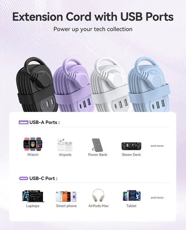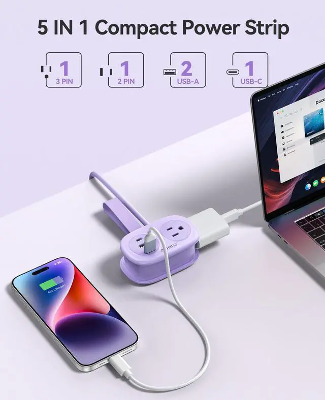 5-in-1 Travel Power Strip with USB C PortOIRCO travel power strip with USB ports has 2 AC power outlets, 2 USB-A ports, and 1 USB-C port. The travel extension cord with multiple outlets can support 5 electronic devices at the same time, such as cell phones, iPads, laptops, desk lamps, cameras, and many other devices.