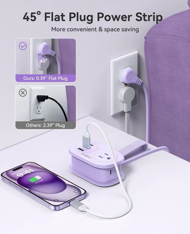 45° Flat Plug Power StripMany hotel sockets are installed behind the bed, and the bed needs to be moved to use it. The ORICO travel extension cord with USB ports adopts a flat plug design and can be used behind a narrow bed or sofa. The 45-degree angle design will not block the bottom socket of the double wall socket and can free up the socket for other uses.