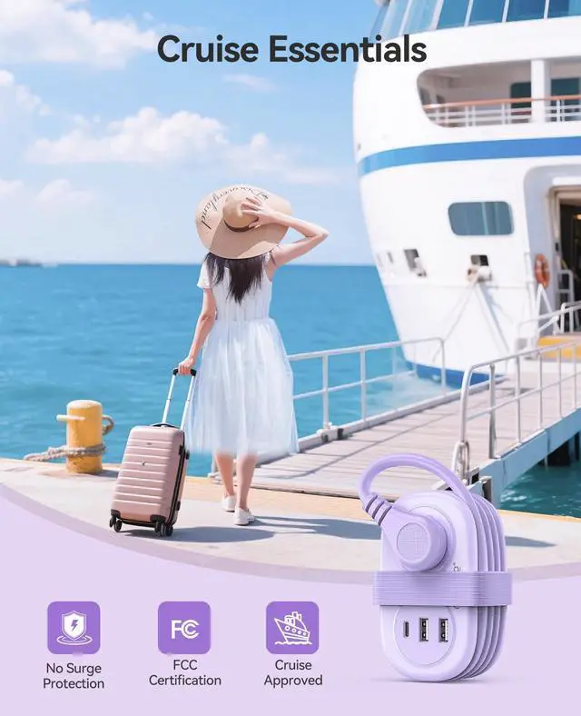 Cruise EssentialsCruise in confidence with our travel power strip! Approved for cruises and designed without surge protection, it's the ultimate travel must-have. Take it anywhere hotels, trips, or cruises and ensure you never run out of charging options. Stay connected and compact, ready for any adventure!